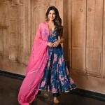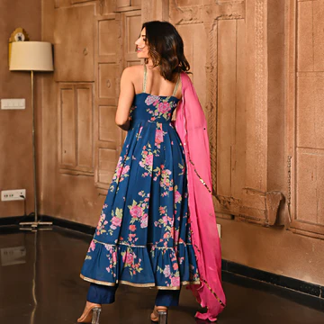 Step into a world of timeless elegance with this Blue Floral Print Georgette Salwar Suit, a mesmerizing ensemble that embodies grace and sophistication. Crafted from luxurious georgette fabric, this suit drapes effortlessly, promising both comfort and style. The delicate floral print scattered across the fabric adds a touch of femininity and charm, reminiscent of a serene garden in full bloom. The soothing blue tones evoke a sense of tranquility, making it perfect for both daytime events and evening soirées. Paired with matching bottoms and a dupatta that completes the look, this ensemble is a true masterpiece of understated elegance, perfect for making a statement wherever you go.